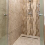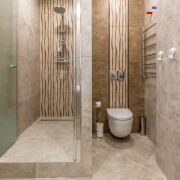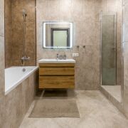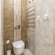 Ванная комната выполнена в лаконичном, но выразительном стиле.