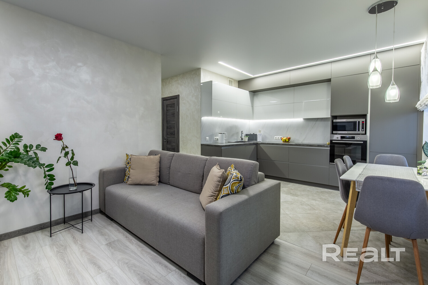 Открытая планировка объединяет кухню с гостиной, визуально расширив помещение и наполнив его светом. Об этом уже позаботились.