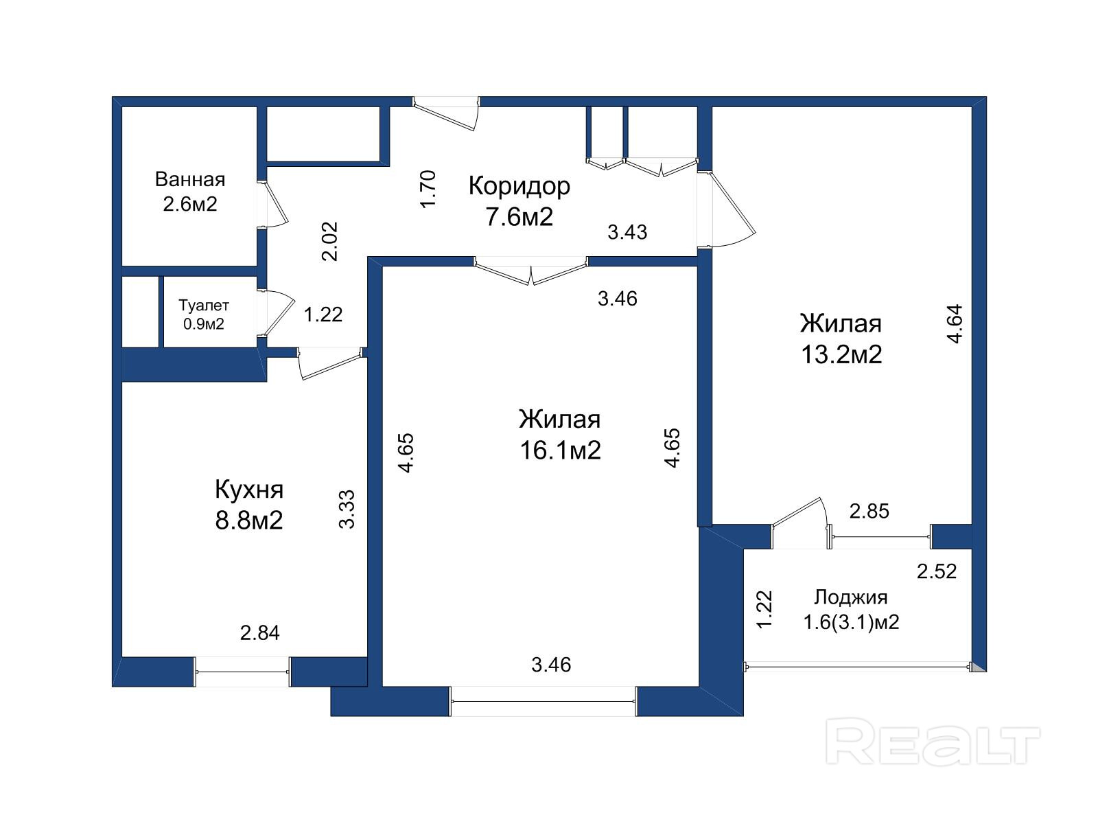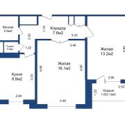 Площадь квартиры по СНБ-51.5. Хорошая планировка: кухня 8,8 м2 правильной квадратной формы и 2 изолированные жилые комнаты (16,1 и 13,2.), большая лоджия. Квартира расположена на 10 этаже 12 этажного дома.