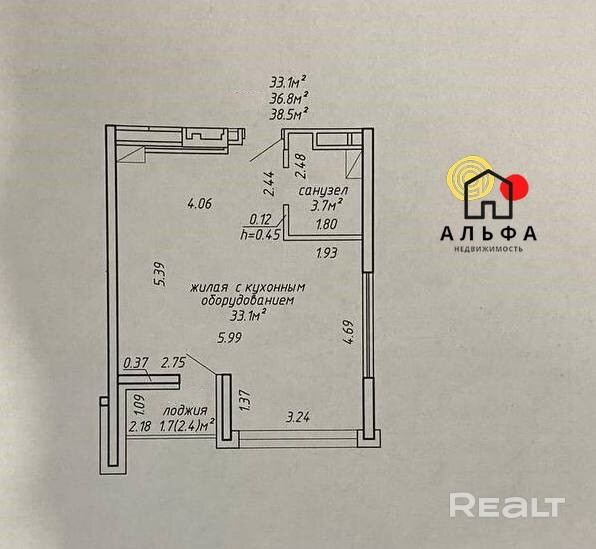 Площадь квартиры по СНБ: 38,5 м. кв.