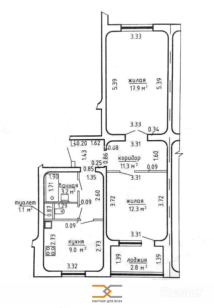 Площадь квартиры по СНБ 57,6 м.кв. Отличная планировка: окна на две стороны. Просторные изолированные 18 и 13.3 м.кв. Большая кухня 9 м.кв., оборудована кухонным гарнитуром и бытовой техникой. Санузел раздельный.