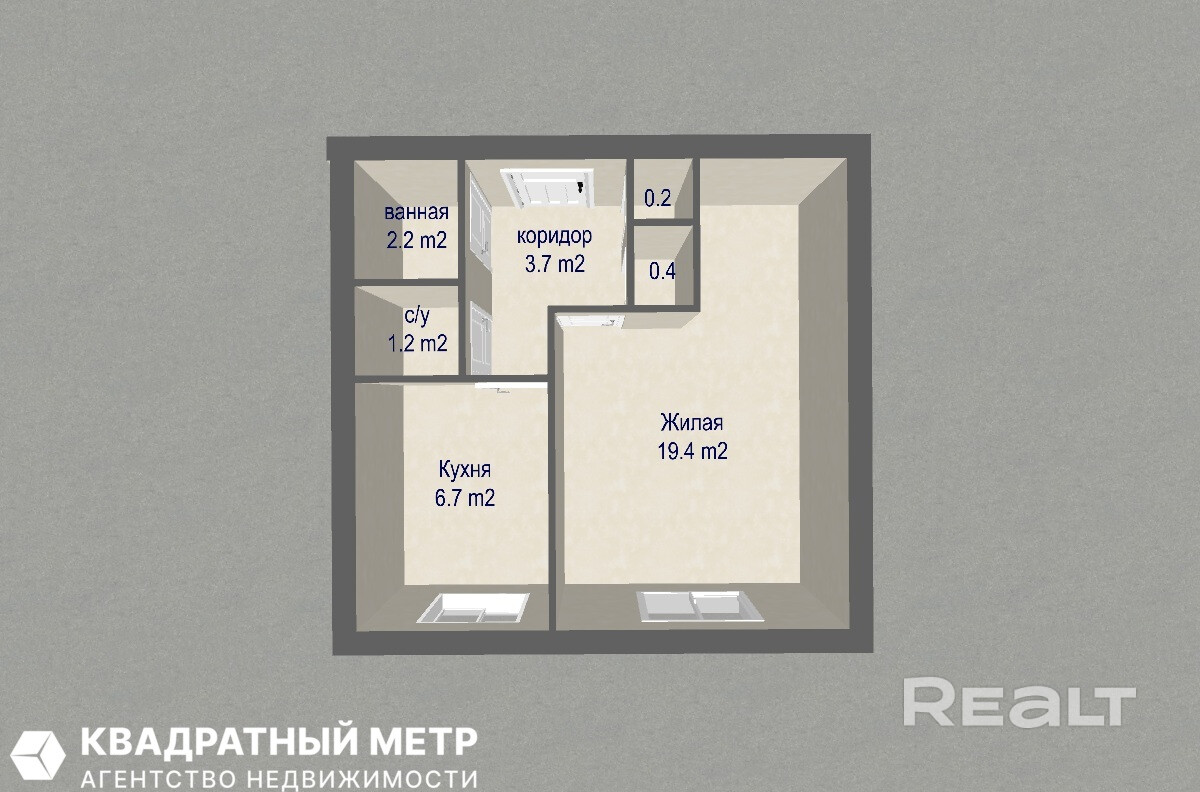 Просторная комната с нишей, 19,4 м2, где достаточно места для обустройства спальной зоны. Кухня- 6,7 м2. Санузел раздельный.