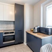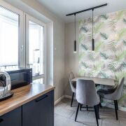 - Просторная кухня (8,3 м2) — полностью укомплектована мебелью и техникой с выходом на лоджию с панорамным остеклением.