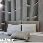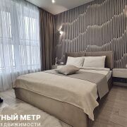 Мастер-спальня выполнена в нежных нейтральных цветах и имеет доступ во вторую гардеробную комнату с окном. Отдельно выделена макияжная зона. А акцентная реечная стена с бра в изголовье кровати еще более усиливает изысканность интерьера.