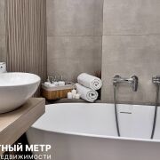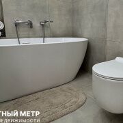 Просторный совмещенный санузел с отдельно стоящей ванной, стильным умывальником и встроенной мебелью, а также электрическим полотенцесушителем добавят комфорта проживанию. Предусмотрен потолочный скрытый карниз для шторки.