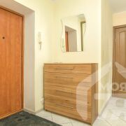 -В прихожей установлен вместительный шкаф-купе с зеркальными дверцами, что помогает эффективно использовать пространство и поддерживать порядок.