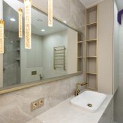 -Санузел оформлен в единой концепции с использованием крупноформатной плитки под мрамор. Подвесной унитаз, интегрированная раковина, акцентная фурнитура в тёплом металле и современное освещение создают интерьер уровня премиум. Зеркало с подсветкой и продуманная система хранения делают пространство не только эстетичным, но и удобным.