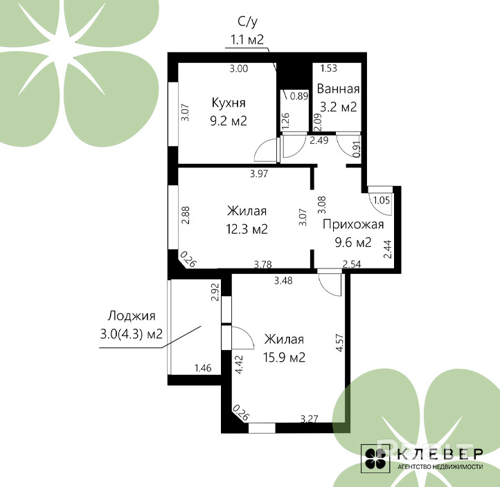 Площадь квартиры по СНБ 54.3 кв.м., общая 51.3 кв. м., кухня 9.2 кв. м. Продуманная планировка: две изолированные комнаты на две стороны дома, просторная кухня, большая прихожая, раздельный санузел.