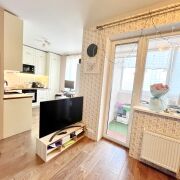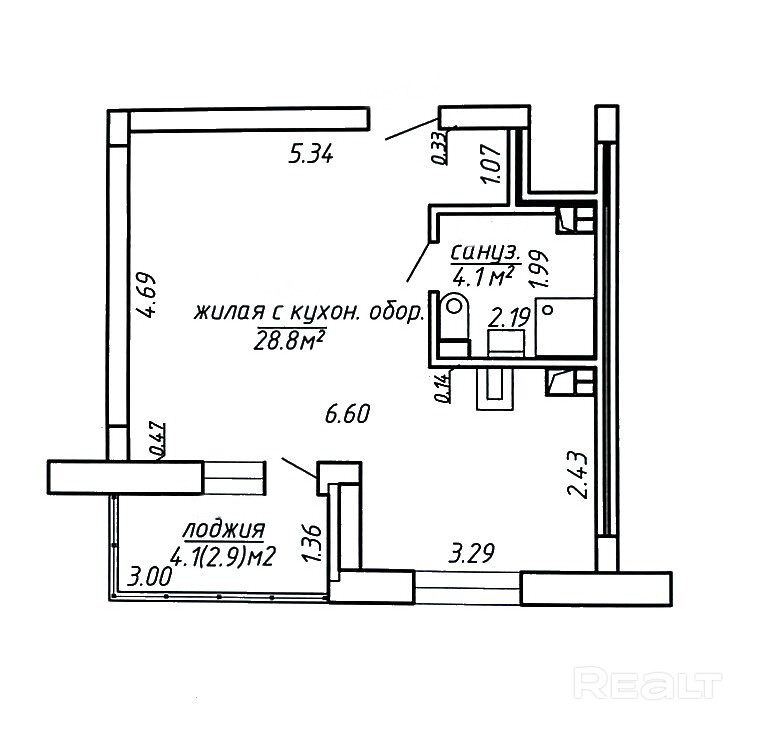 Квартира состоит из жилой комнаты с кухонным оборудованием (28.8 кв.м.), которая зонирована со спальней, санузла, совмещенного с ванной (4.1 кв.м.) и лоджии (4.1 кв.м.).