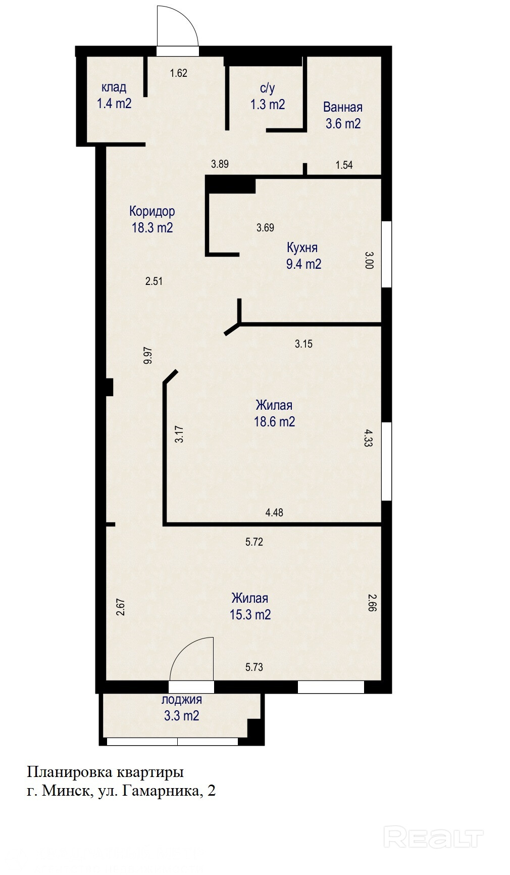 Общая площадь  67,9  кв. м.,  жилая площадь 33,9 кв. м, кухня 9.4  кв. м.  высота потолков 2.5 м., лоджия  3,3 кв.м.