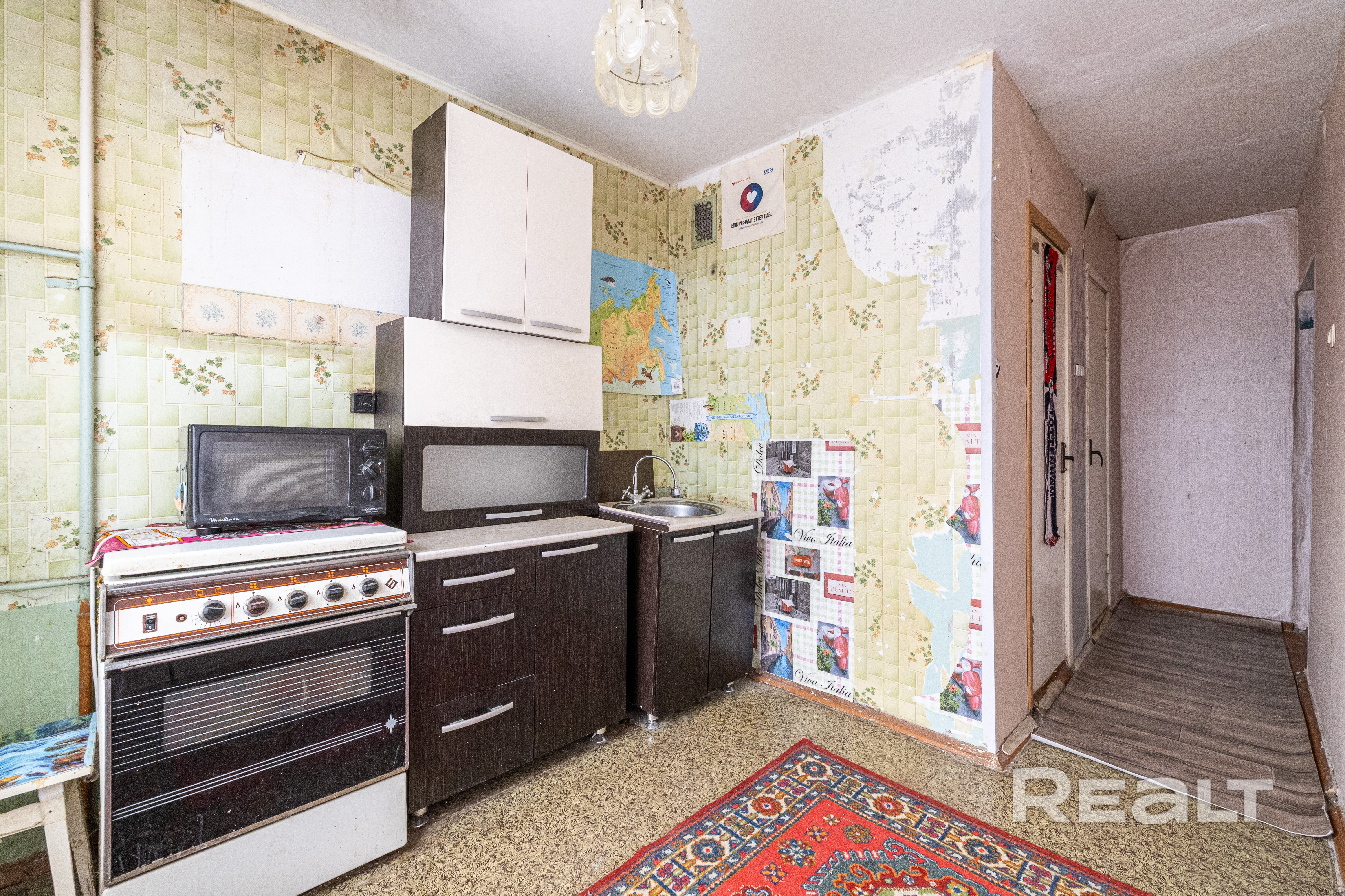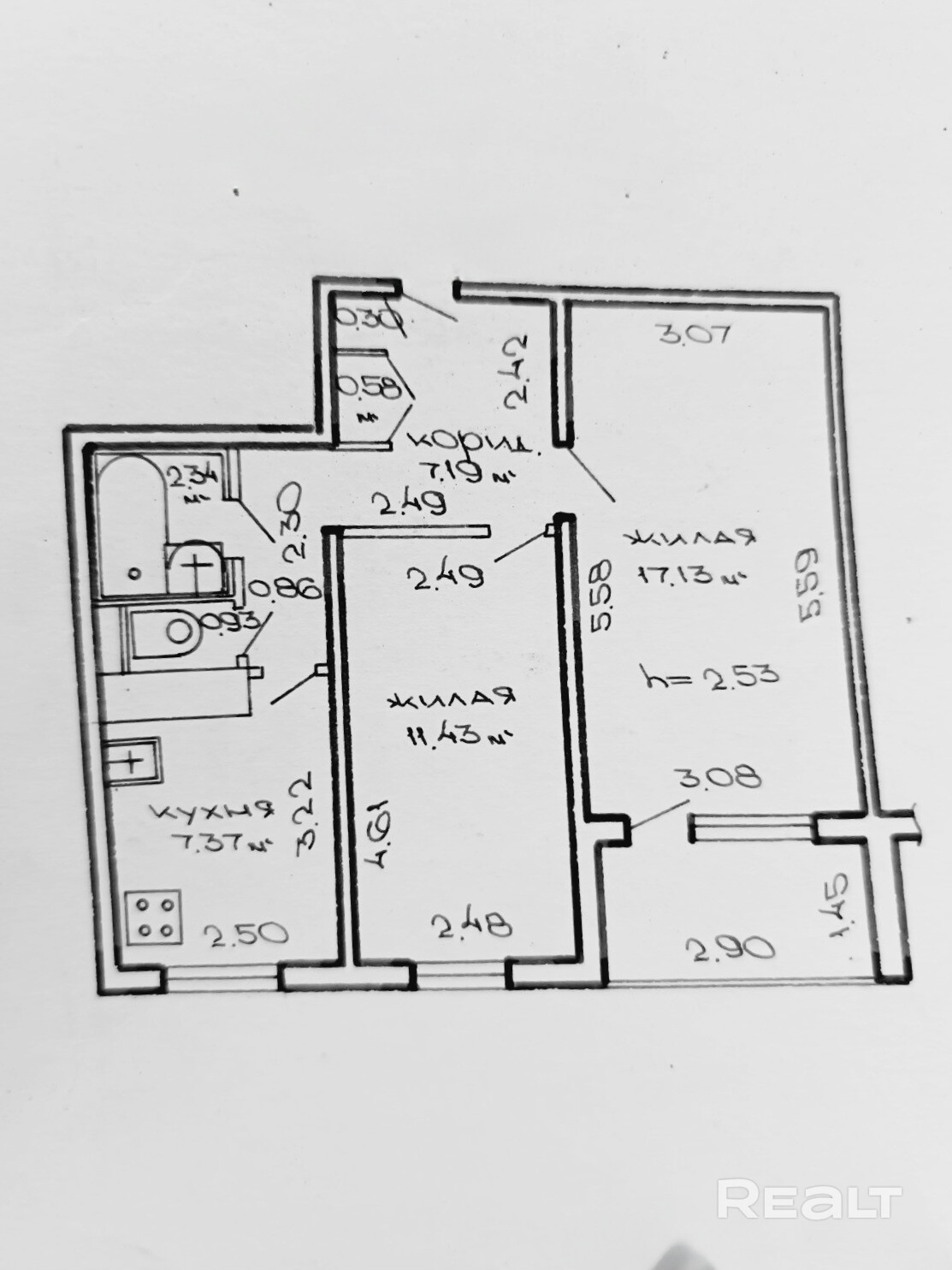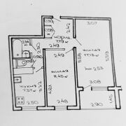Площадь общая 46.5м2 (по СНБ 48.6м2), жилая площадь 28.2м2 состоит из двух изолированных комнат (17.13м2 и 11.43м2), площадь кухни 7.37м2, санузел раздельный, застекленная лоджия 2.1м2, высота потолков 2.52м.