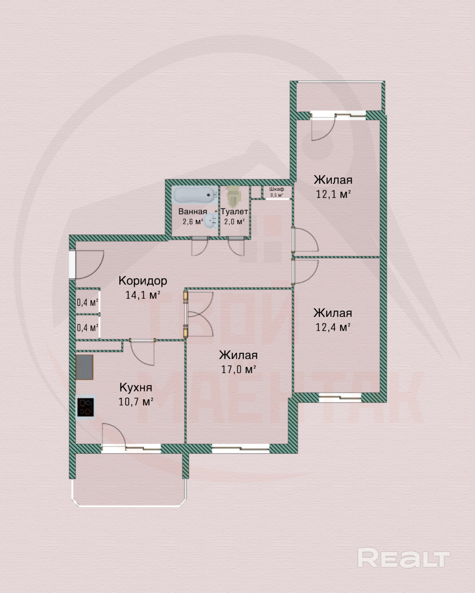 Гостиная- 17 м2, спальня -12,1 м2 (с выходом на лоджию), детская -12,4 м2.