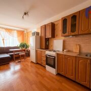 -Большая кухня (13,2 кв.м): Просторная и удобная. Здесь остается модульный кухонный гарнитур, кожаный угловой диван, обеденный стол и холодильник.