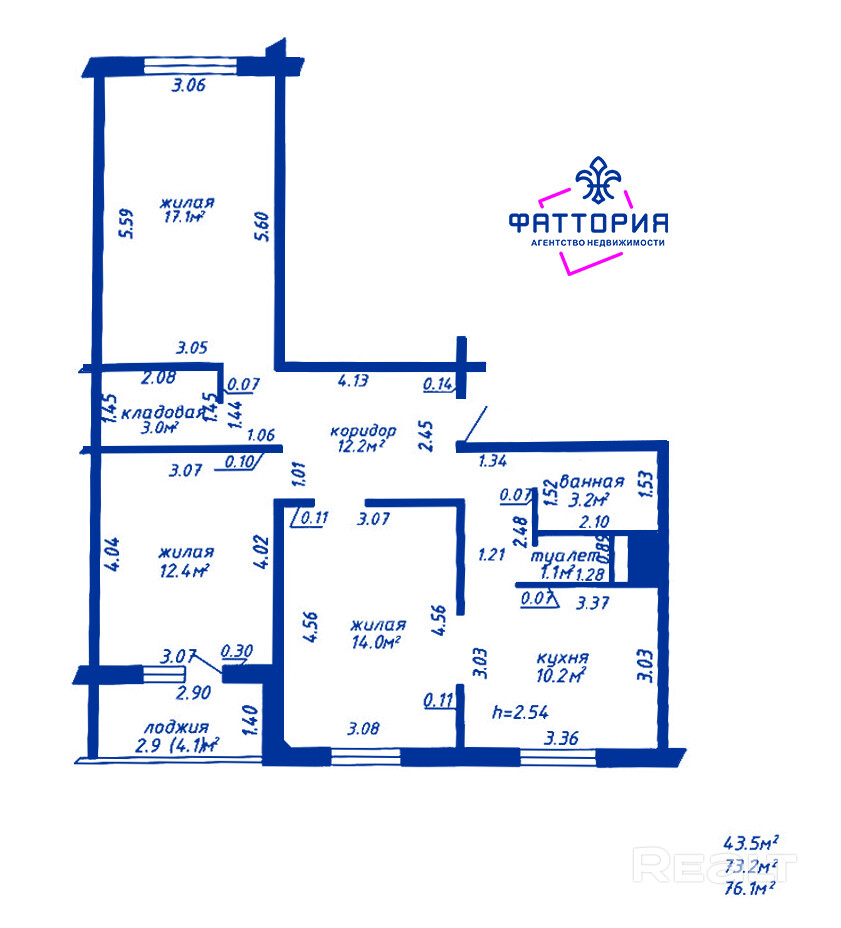 Площадь квартиры по СНБ – 76,1м2.