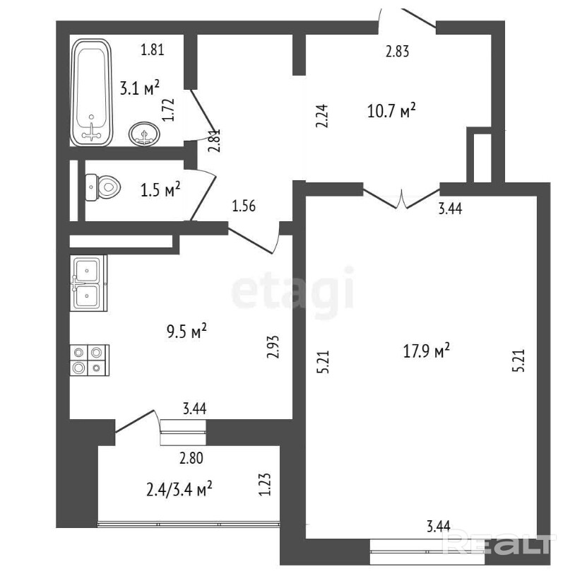 - просторная кухня 9,5 м2 с выходом на лоджию