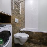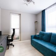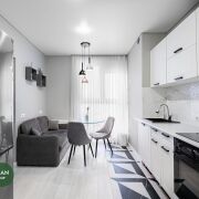 Рациональная планировка: уютная кухня-гостиная, совмещенный с/у, выделены две комнаты, одна из которых с выходом на застекленную лоджию, а также имеется гардеробная с системой хранения. На полу плитка с подогревом (коридор, зона кухни, санузел), в комнатах ламинат. Потолки с теневым профилем. Окна в пол. Квартира полностью укомплектована всей необходимой мебелью и бытовой техникой.