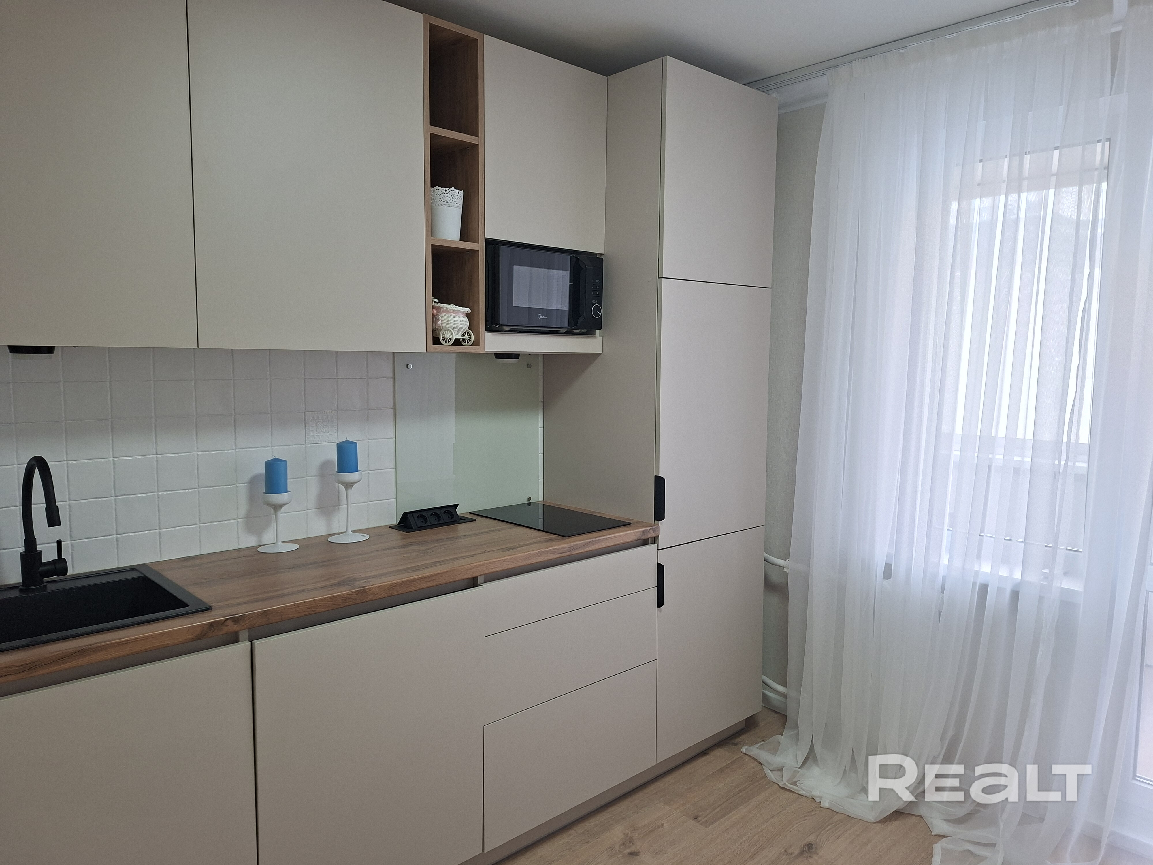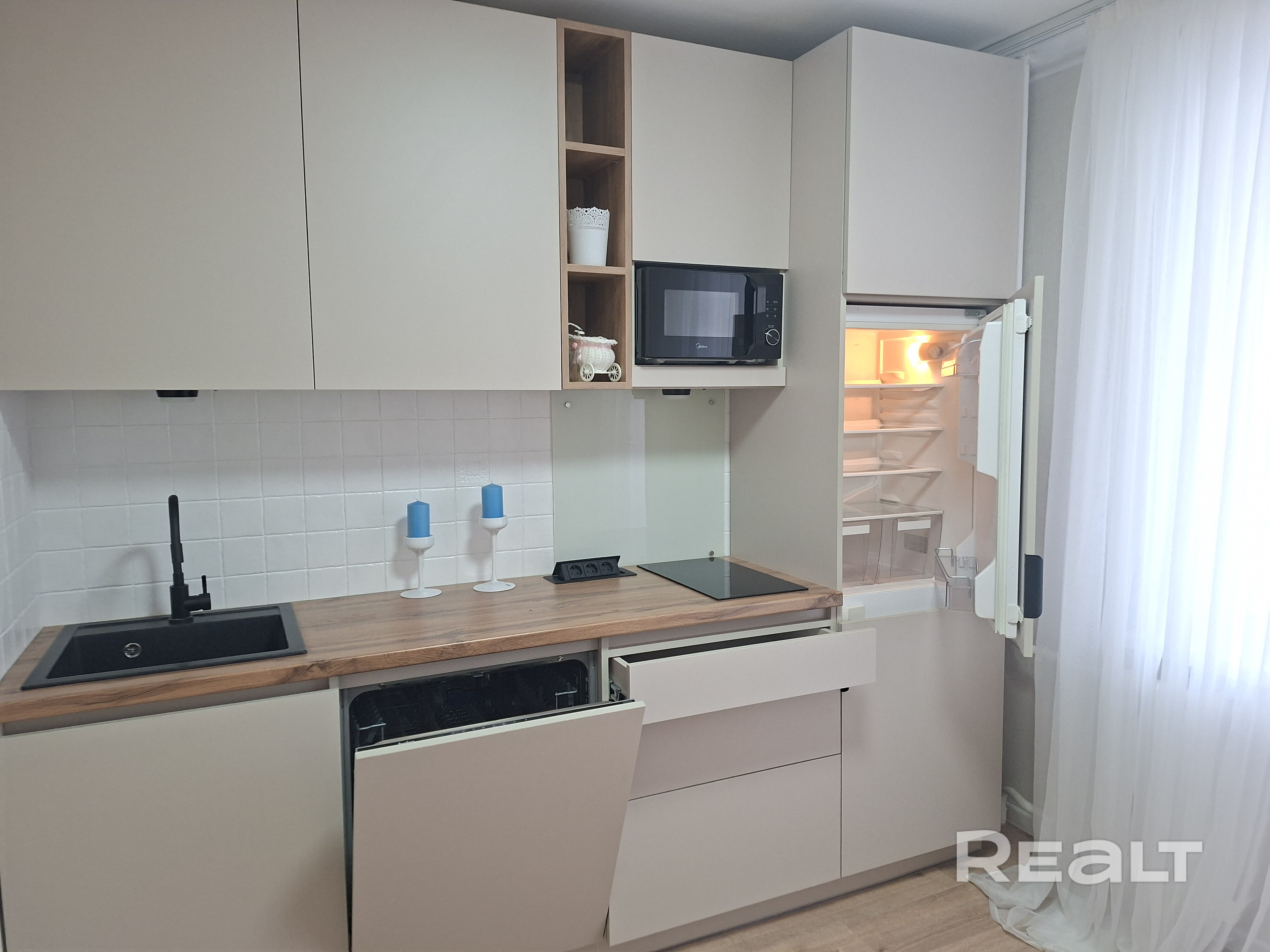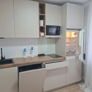 Все новое: встроенная кухня с холодильником, индукционной варочной поверхностью, посудомоечной машиной, ламинат, сантехника, диван.