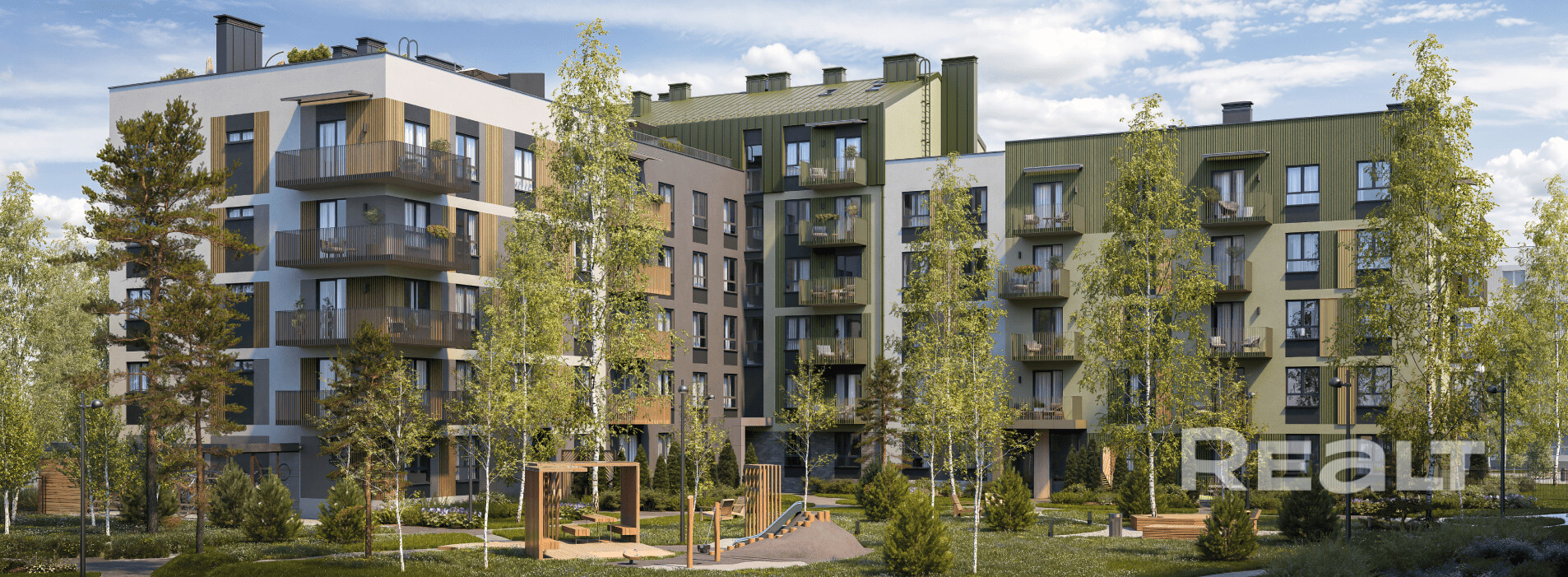 С двух сторон обрамлен зеленым коридором, обеспечивая жителям живописные виды из окон.