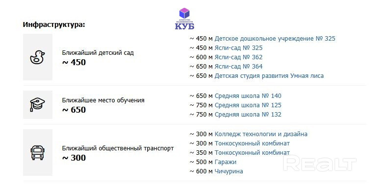 - Рядом 2 детских сада, 2 школы, Минский государственный колледж технологии и дизайна, Республиканский институт профессионального образования — всё для семьи и учебы.