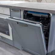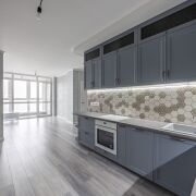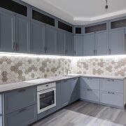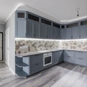 Кухня изготовлена на заказ: фасады из крашеного МДФ, вся фурнитура — Blum (Австрия), обеспечивающая плавную и надёжную работу механизмов.