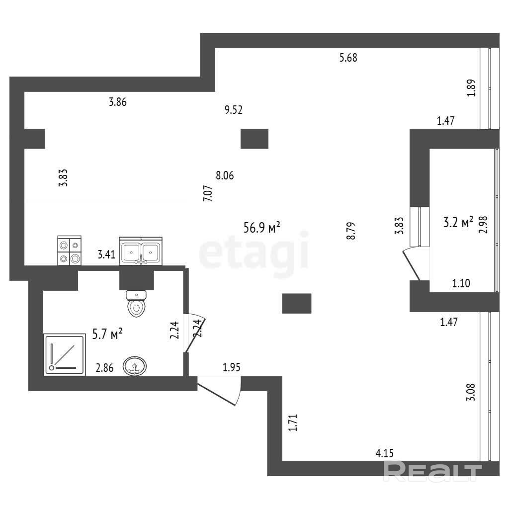 Площадь по СНБ — 64,8 м2. Удачная планировка: просторная кухня-гостиная и две отдельные комнаты. Формат квартиры позволяет комфортно организовать пространство как для семьи, так и для сдачи в аренду.