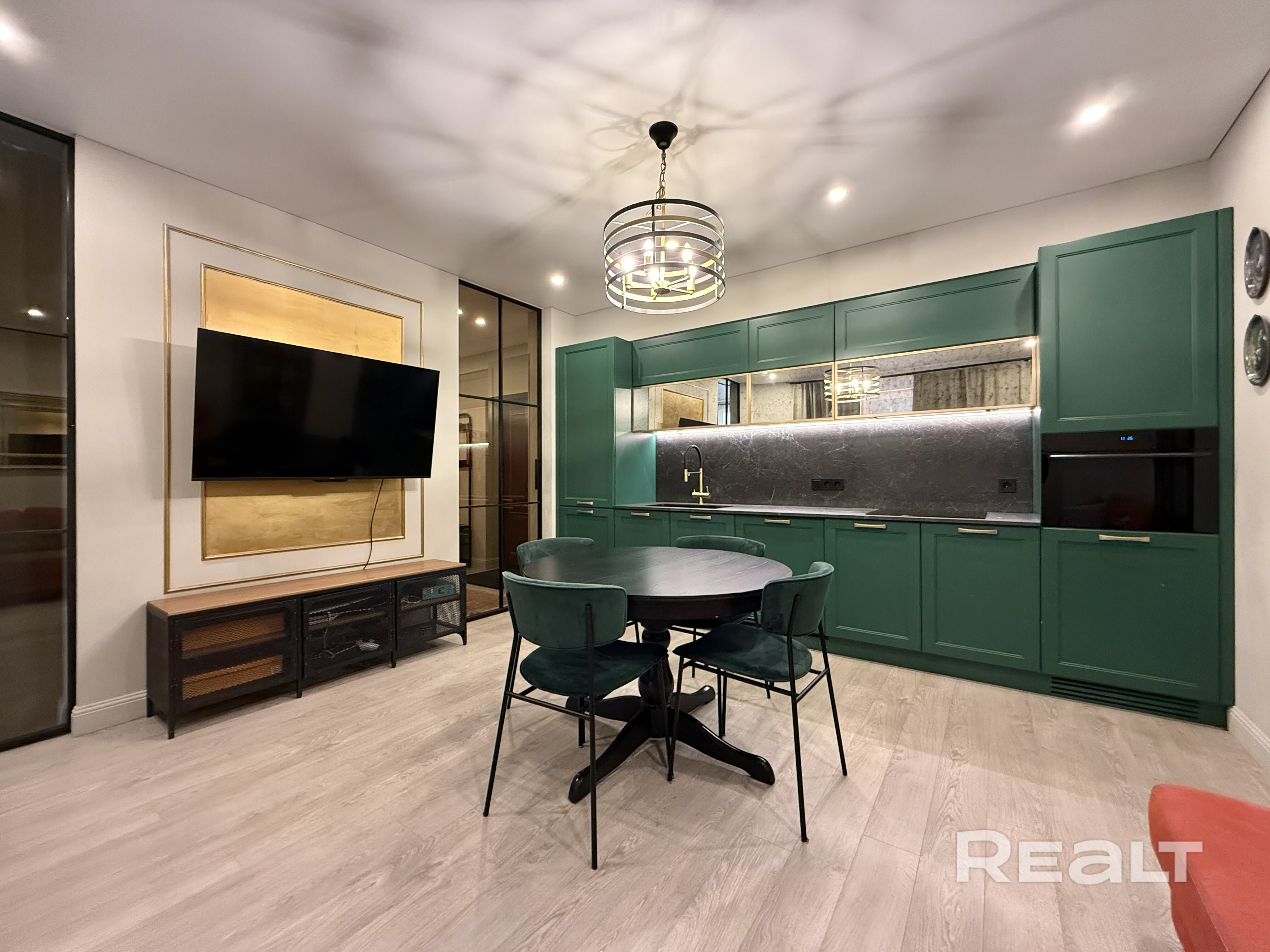 — Просторную гостиную с кухонной зоной. Кухня изготовлена из массива по индивидуальному проекту и оснащена встроенной импортной техникой: СВЧ с функцией духового шкафа, посудомоечная машина, индукционная варочная панель. Здесь удобно принимать гостей и проводить вечера в кругу семьи. Установлен кондиционер. Утеплённая лоджия с системой «тёплый пол» расширяет жилое пространство.