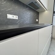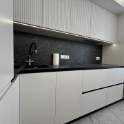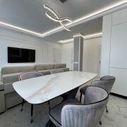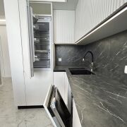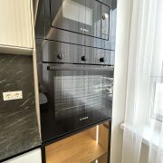 - Яркая кухня-гостиная со встроенной техникой BOSCH, индукционная варочная поверхность 4 комфорки BOSCH, духовой шкаф BOSCH, 45-ая посудомоечная машина BOSCH, микроволновая печь BOSCH, холодильник SAMSUNG, материал кухни мдф, доводчики BLUM, столешница из искусственного камня.