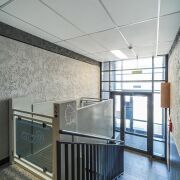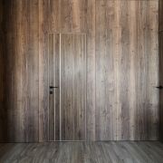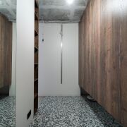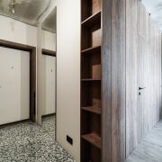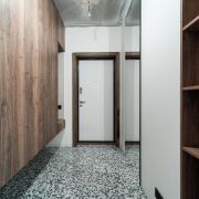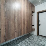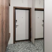 В прихожей дорогая итальянская широкоформатная плитка, зеркало в пол с подсветкой, парящие шкафы,