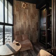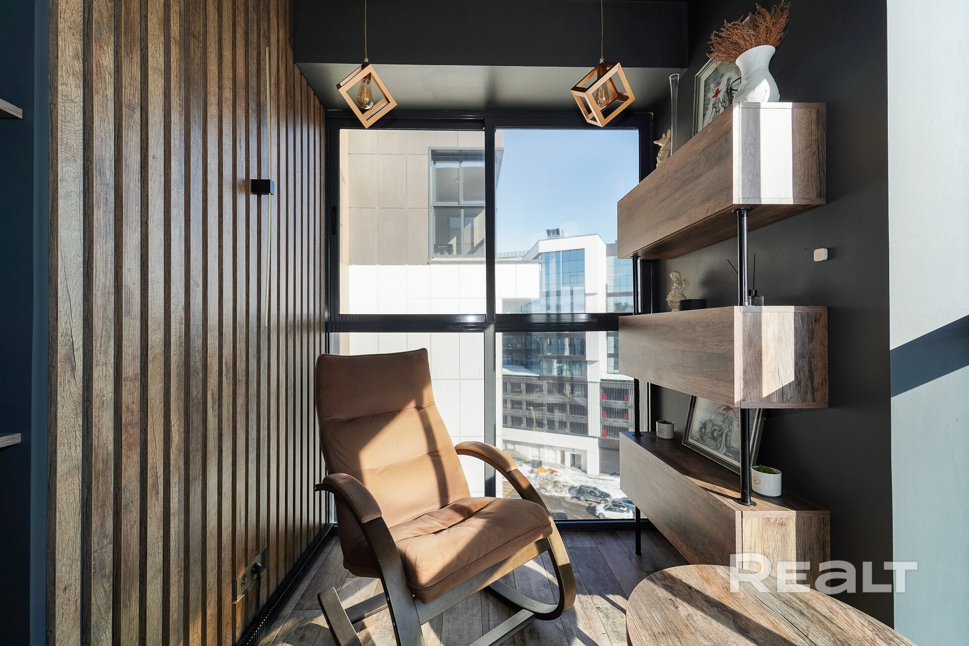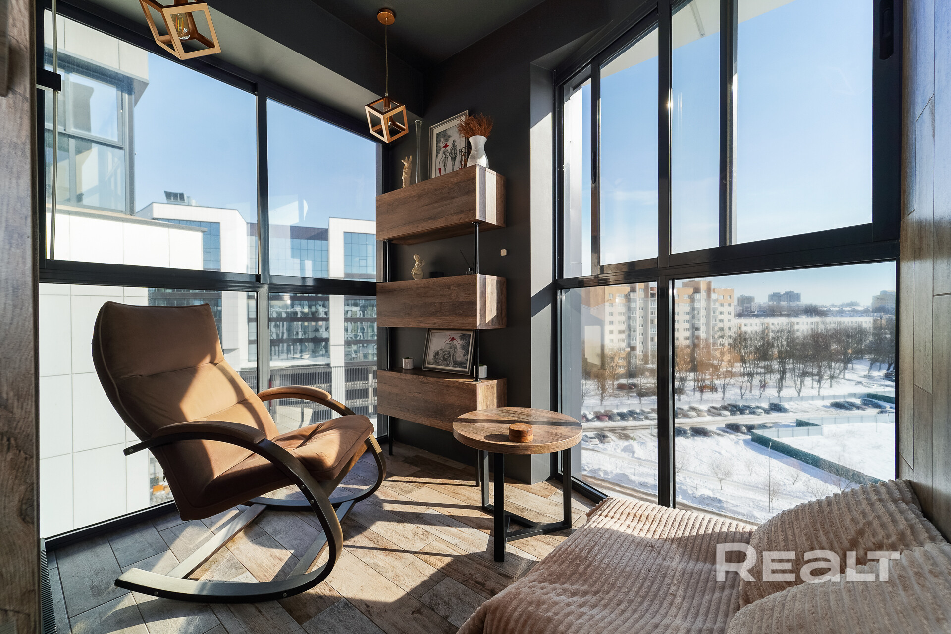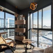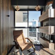 Лоджия выполнена под лаунж зону с кальянной, оборудована спальным местом, есть небольшой козырек на фасаде, который после 12 часов сдерживает активные лучи солнца.