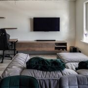 В доме тренажерный зал и детская комната для жителей. Во дворе разнообразная большая детская площадка и зона отдыха для взрослых.