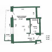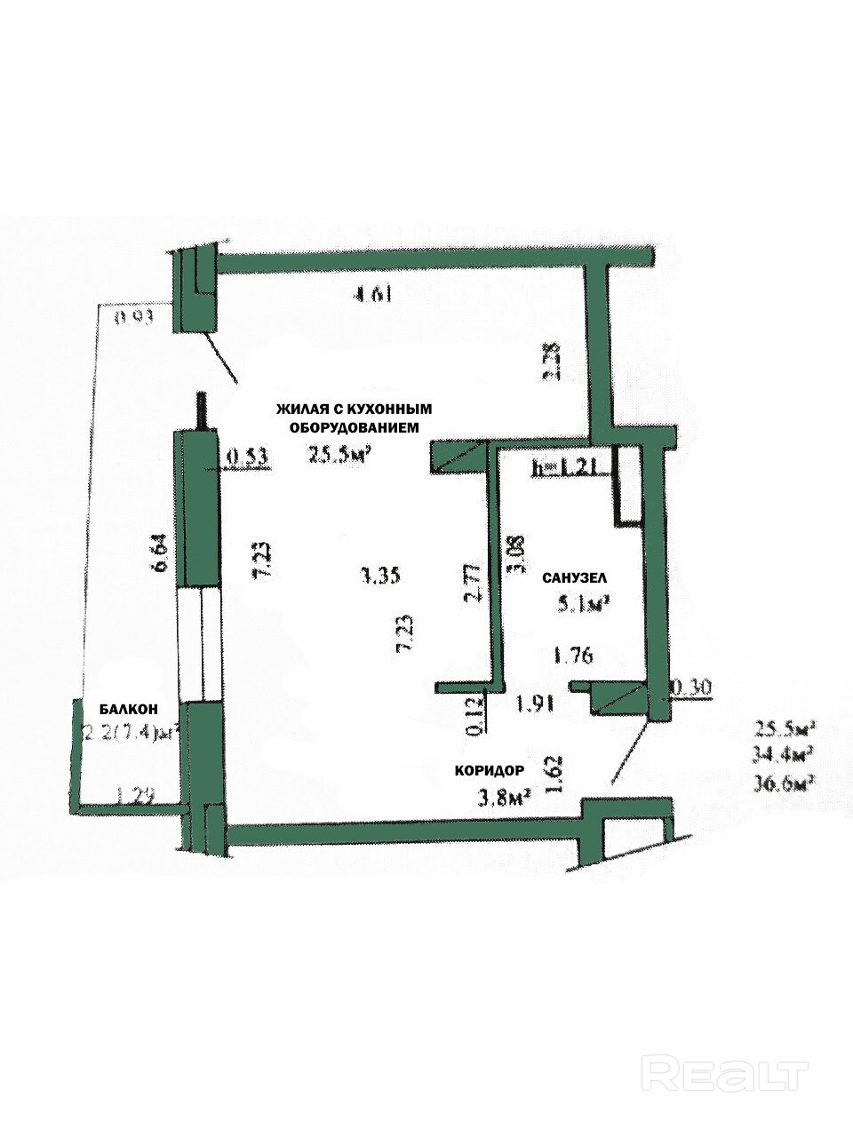 Общая площадь квартиры 34,4 кв.м. (по СНБ 36,6 кв.м.):