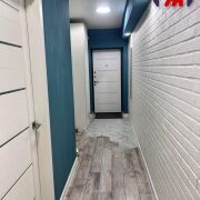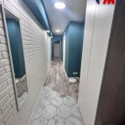 - Санузел совмещенный с качественной плиткой, ванной под экраном, современной раковиной с тумбой, местом для стиральной машины. Коридор с декоративной белой кирпичной стеной, встроенными шкафами и стильными синими акцентами.