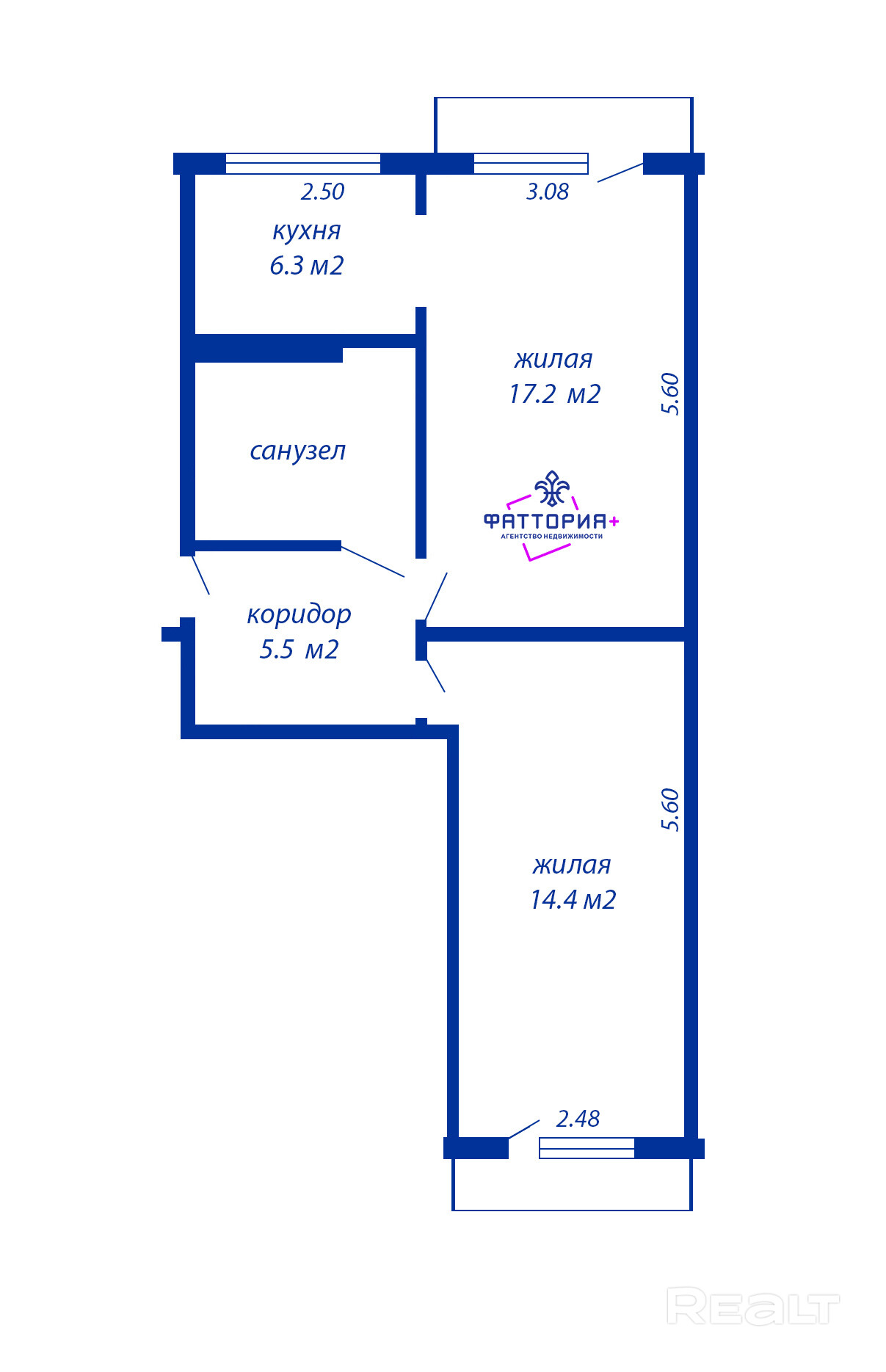 - Раздельные жилые комнаты на две стороны (17,2м2 и 14,4м2)