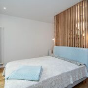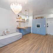 - Квартира выполнена в современном дизайнерском стиле - светлая, продуманная, с выразительной планировкой и четким разделением зон. Пространство включает гостиную, кухню и спальню, создавая ощущение легкости и воздуха. Зона спальни отделена стильной деревянной перегородкой, что придает приватности, но сохраняет ощущение открытого пространства.