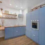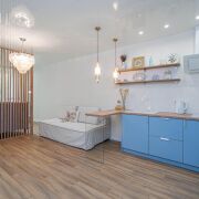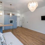 - Интерьер оформлен в спокойных тонах: стены окрашены в нежные цвета, а на полу уложен качественный ламинат, создающий уют и тепло. Натяжной потолок с современным освещением визуально расширяет пространство и делает квартиру особенно светлой.