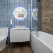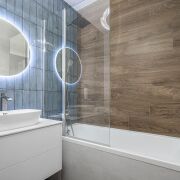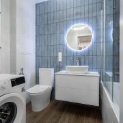 - Ванная комната выполнена в современных тонах: сочетание фактур дерева и небесно-голубой плитки создает ощущение спа-пространства. Здесь установлена качественная сантехника, удобная ванна, стильное зеркало с подсветкой и вместительная тумба. Все продумано для вашего комфорта.