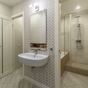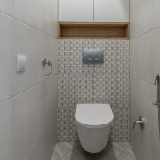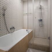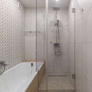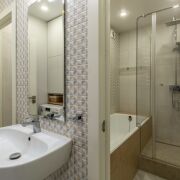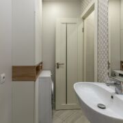 Раздельный санузел оборудован большой ванной 170×70 и душевой кабиной с тропическим душем. Установлены унитаз с функцией псевдобиде, немецкие смесители Wasserkraft, стиральная машина Bosch. Окна ПВХ. Лоджия застеклена и утеплена — дополнительное функциональное пространство. Видеонаблюдение и сигнализация обеспечивают безопасность.