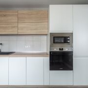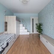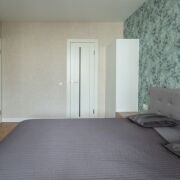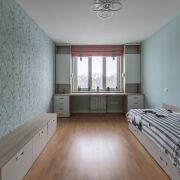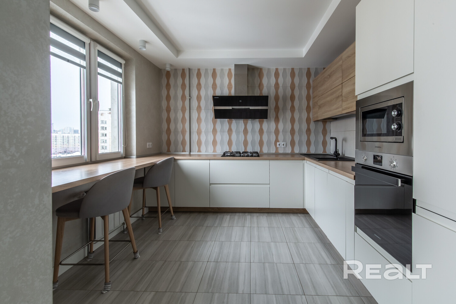 Функциональная планировка включает встроенные системы хранения во всех комнатах и отдельную гардеробную. Встроенная кухня с фурнитурой Blum и техникой Maunfeld: газовая варочная панель, вытяжка, электрический духовой шкаф, встроенная микроволновая печь, встроенный холодильник и посудомоечная машина — всё гармонично интегрировано в интерьер.