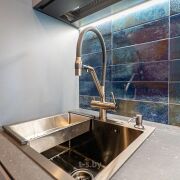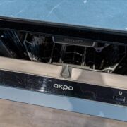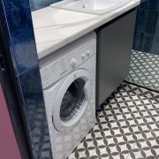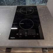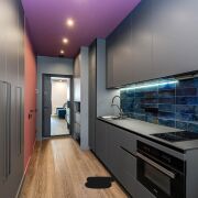 Современная кухня с встроенной техникой: посудомоечная машина, духовой шкаф, варочная поверхность, холодильник, а также телевизор 65", стиральная машина.