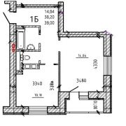 1-комнатная квартира 39,53 м2 в кирпичном доме (кухня 10 м2)