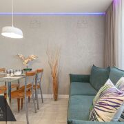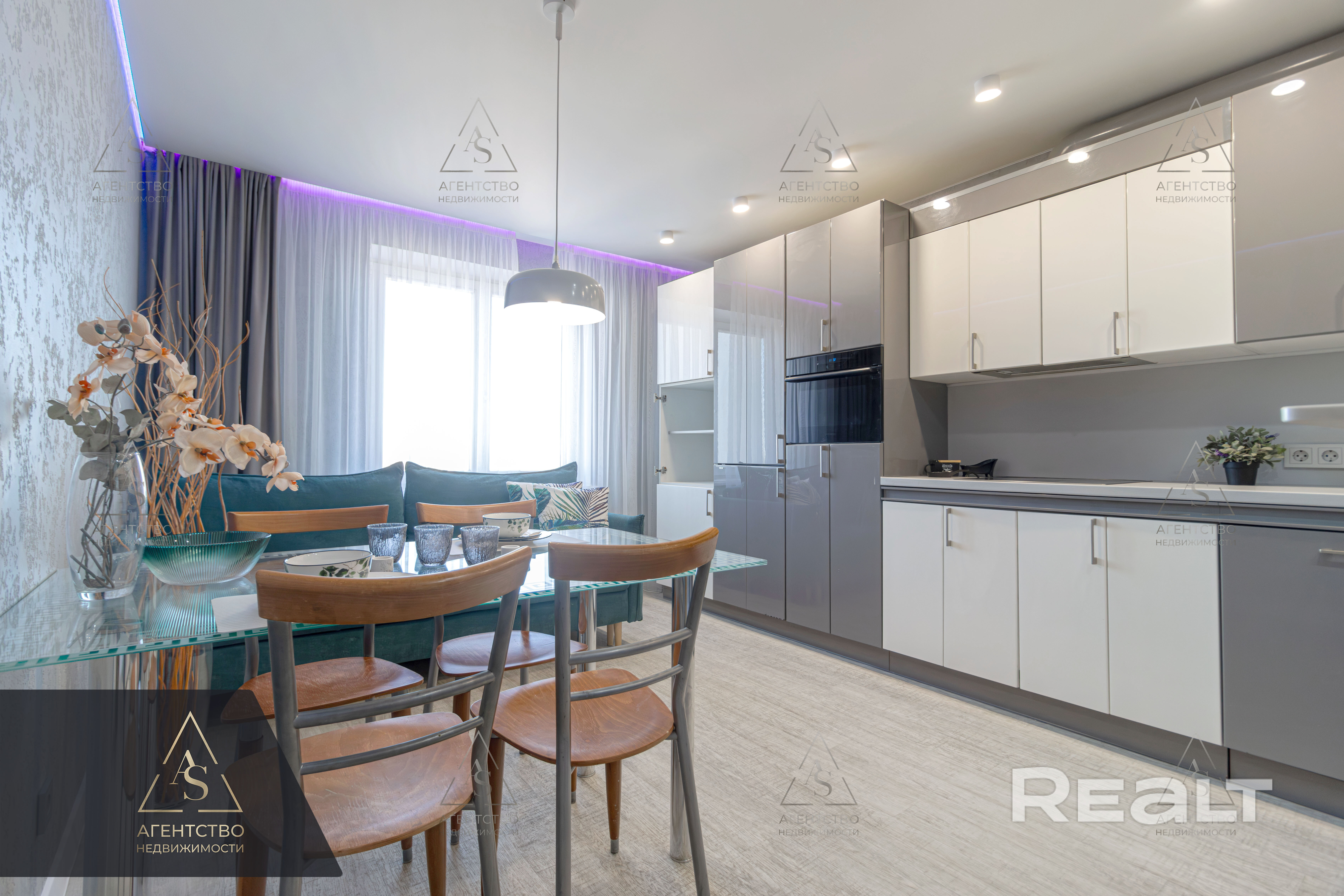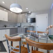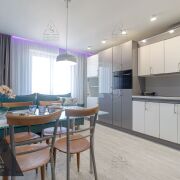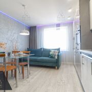 Сердце дома — кухня-гостиная (17 м2). Панорамные окна наполняют комнату мягким светом и открывают вид на благоустроенный двор. Здесь нет шума дорог — только спокойствие и зелень. Высокие потолки, авторские сценарии освещения и встроенная техника премиум-класса подчеркивают статус интерьера.