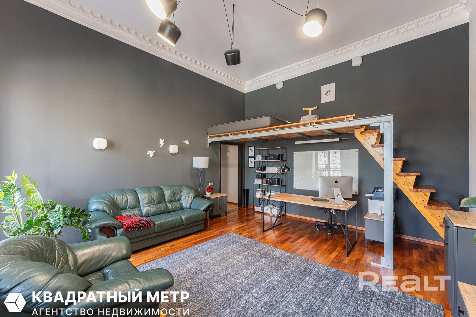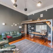 Две изолированные жилые комнаты: 25,5 м2 (гостиная) и 14,2 м2 (спальня). Кухня-столовая 10,5 м2. Высота потолков 4 метра — невероятный объем воздуха, который невозможно передать фотографиями. Дополнительные антресольные зоны (с высотой 2 метра) — под кабинет или лаунж. Гардеробная в 4 метра с лестничным блоком.