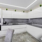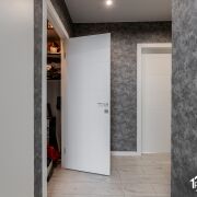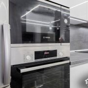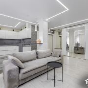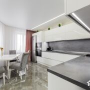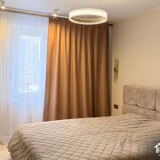 В квартире выполнена качественная и функциональная отделка. На кухне уложена плитка, в жилых комнатах — ламинат. Натяжные потолки по всей квартире. Установлены ламинированные межкомнатные двери. Кухня встроеннаz - ламинированная, укомплектована премиальной бытовой техникой Bosch и Electrolux. Предусмотрены вместительные шкафы-купе и отдельная гардеробная. Полы с подогревом.
