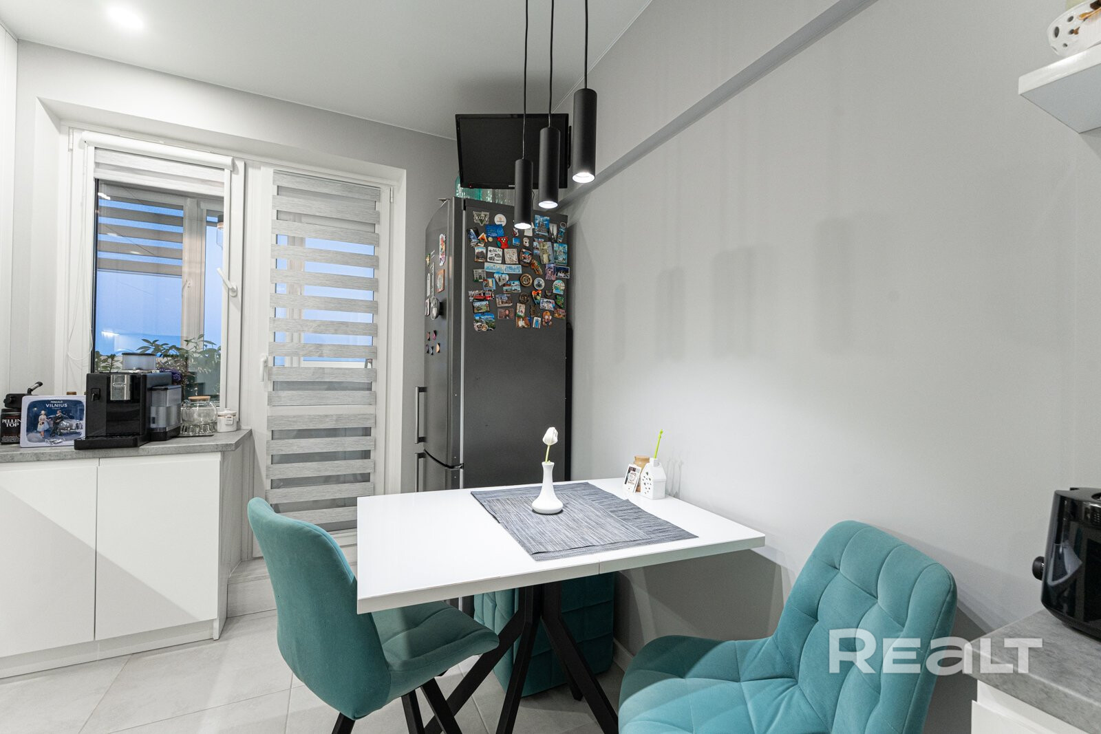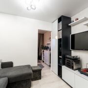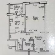 Общая площадь 43.6 м2 по СНБ. Жилая комната 16.8 м2 разделена на 2 зоны- спальня +место для отдыха. Кухня 8.5 м2 со встроенной техникой( частично остается).