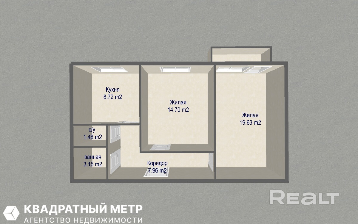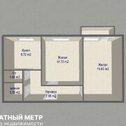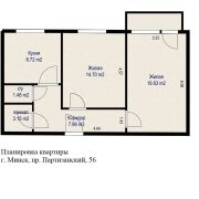 Представляем вашему вниманию просторную квартиру 56,74 м2 с двумя раздельными комнатами 19,63 м2 и 14,7 м2 и кухня-8,72 м2.