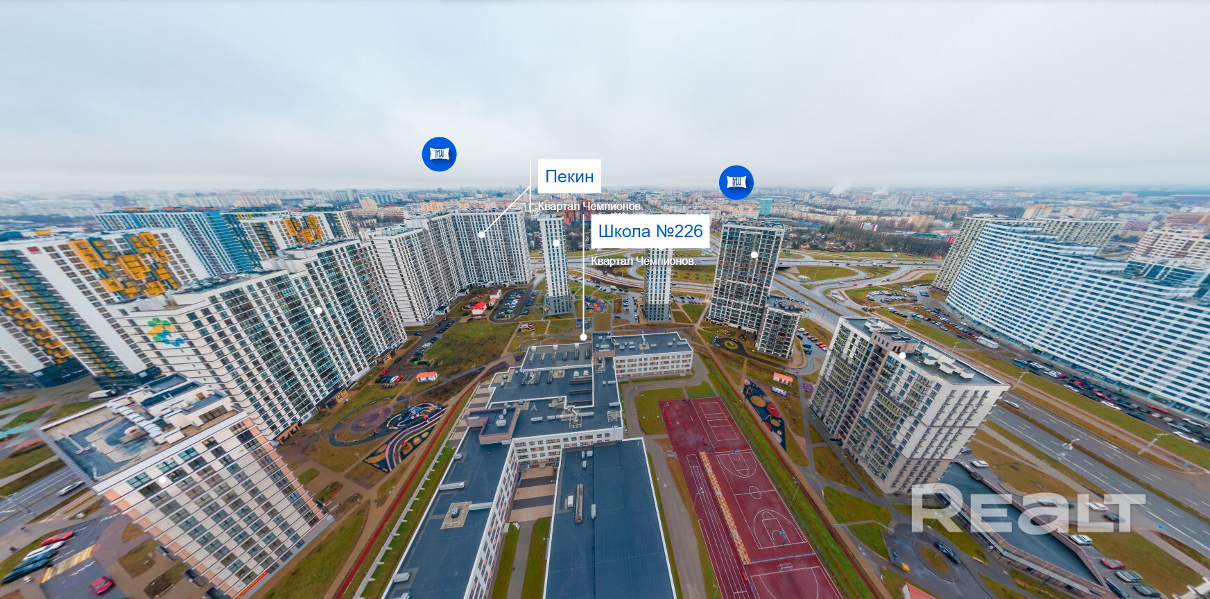 Спортивные площадки, вело парковки и благоустроенные дворы.