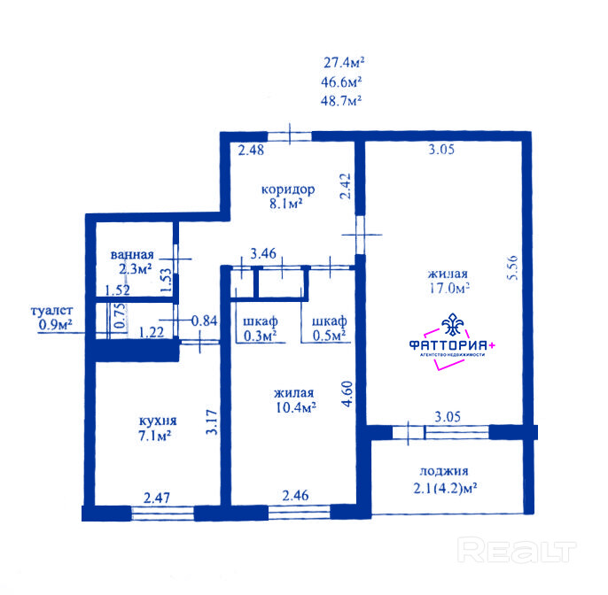 Общая площадь 48,7м.кв., раздельные комнаты 17м и 10,4м, кухня 7,1м, раздельный санузел.