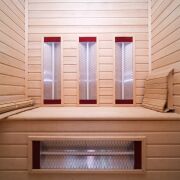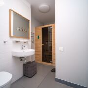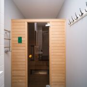 Два санузла: в одном расположена ванная, в другом - душевая и сауна. В коридоре для хранения вещей организованы вместительные шкафы.