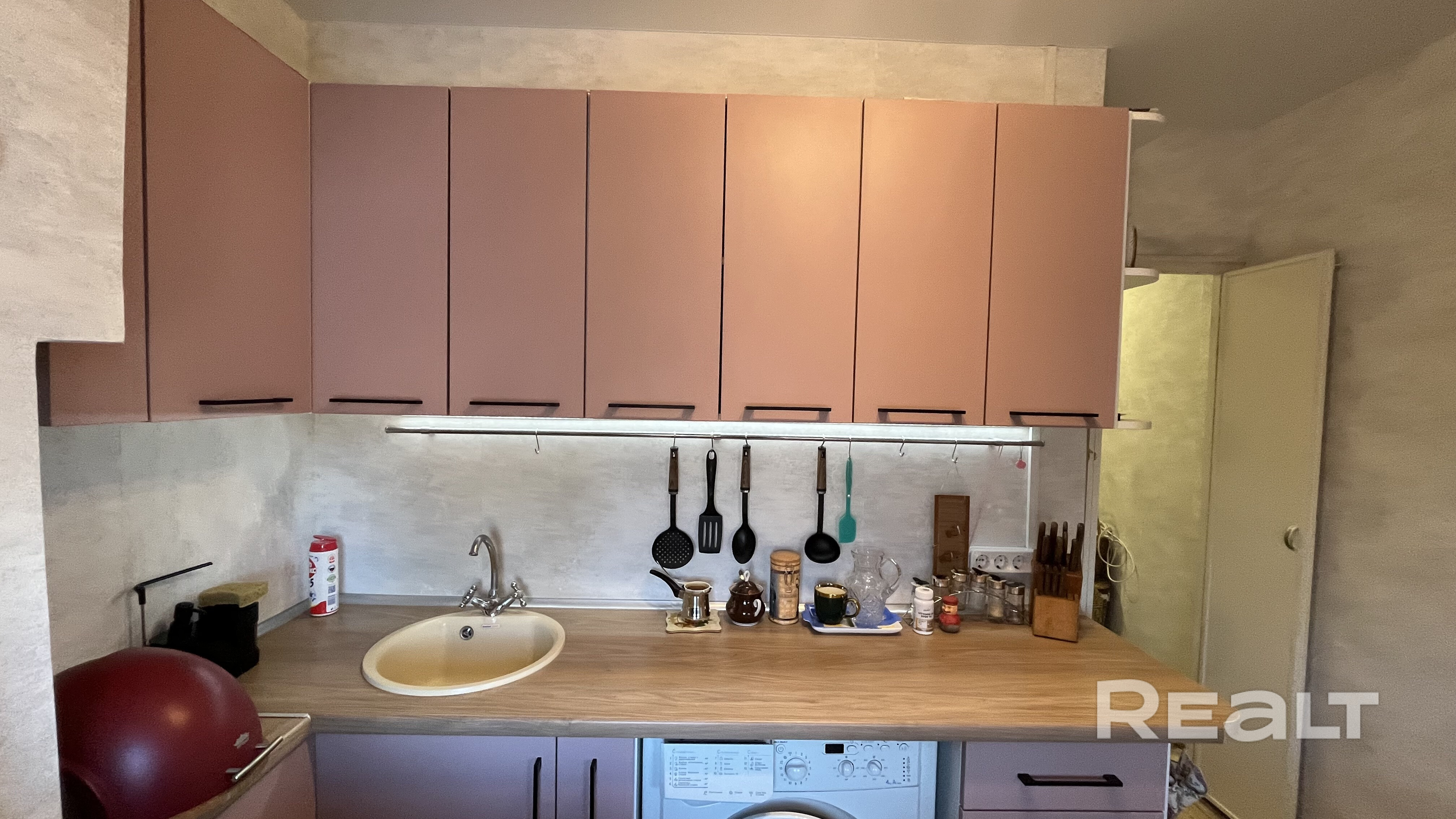 Кухня позволяет разместить необходимую технику: газовая плита, холодильник, стиральная машина.