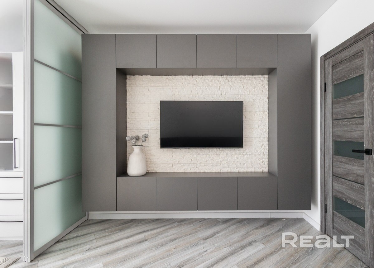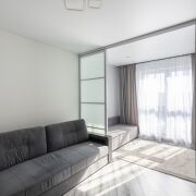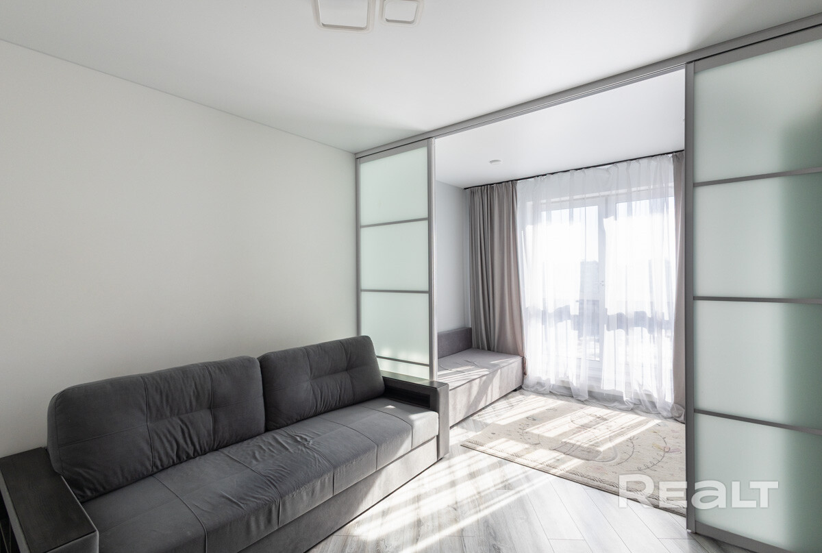 Свет и воздух в каждой комнате.· Большая комната 17,9 м2 разделена на зоны с помощью стильных раздвижных дверей из матового стекла. Это идеальное решение для пары, где один работает, а другой отдыхает. А панорамные окна наполняют светом и рашриряют пространство.